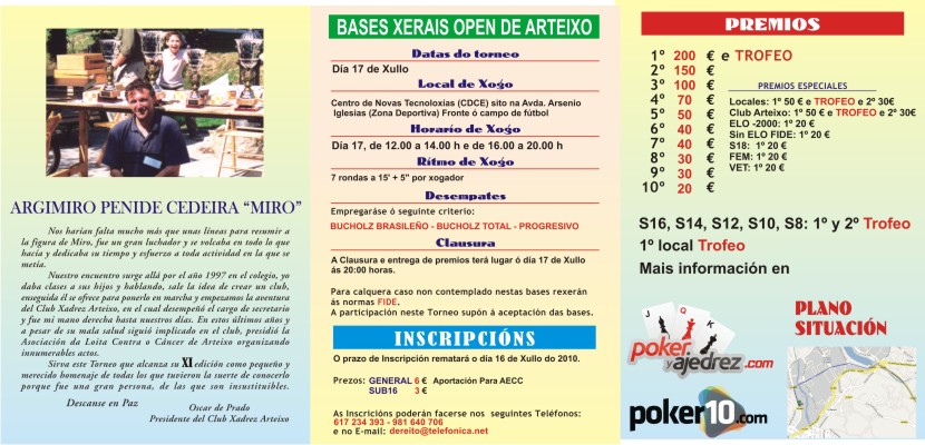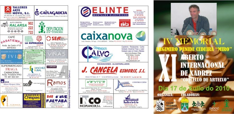 El próximo sábado día 17 de Julio se celebra en Arteixo el XI Open Internacional Concello de Arteixo IV Memorial Miro, un torneo ya tradicional por estas fechas organizado por el Club Xadrez Arteixo y la colaboración del Concello de Arteixo y de numeroras empresas que sin ellos seria imposible celebrar un evento como este ya en su XI edición.